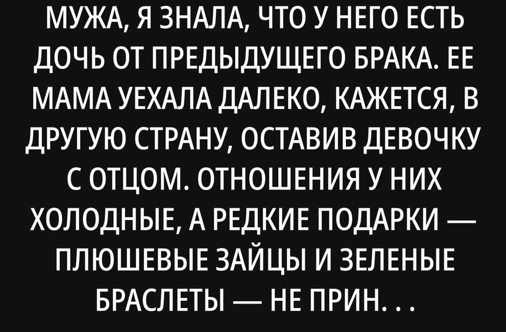 Когда я вышла замуж за своего мужа, я знала, что у него есть дочь от предыдущего брака. Ее мама уехала далеко, кажется, в другую страну, оставив девочку с отцом. Отношения у них холодные, а редкие подарки плюшевые зайцы и зеленые браслеты не приносят радости; она тоскует по материнскому голосу, который теперь звучит лишь во сне.