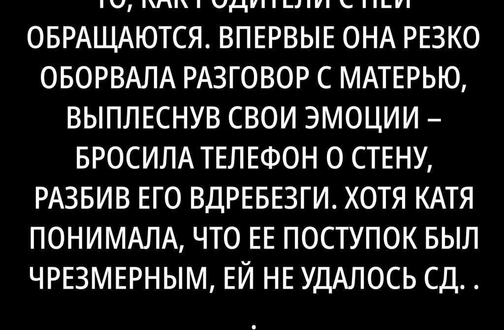 Катя больше не могла терпеть то, как родители с ней обращаются. Впервые она резко оборвала разговор с матерью, выплеснув свои эмоции бросила телефон о стену, разбив его вдребезги. Хотя Катя понимала, что ее поступок был чрезмерным, ей не удалось сдержать бурю чувств: злоба, обида и отчаянное бессилие смешались внутри нее. Слёзы хлынули из глаз, и она ощутила всю тяжесть происходящего.