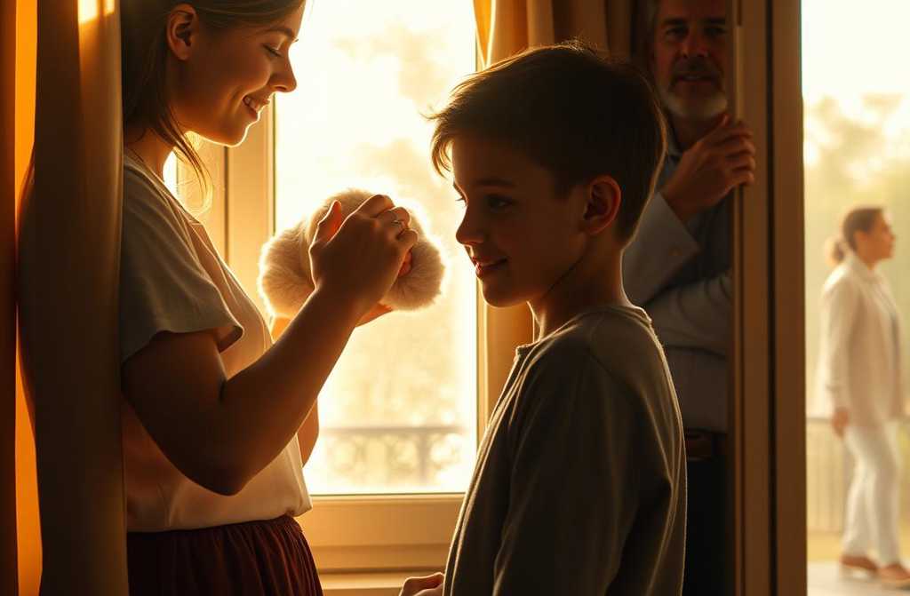 Однажды Артём, проходя по коридору, остановился у двери. Изнутри доносились тихие голоса. Он заглянул и остолбенел: его сын сидел перед зеркалом, позволяя Надежде прикасаться к своим волосам, а на его лице блуждала лёгкая улыбка.
