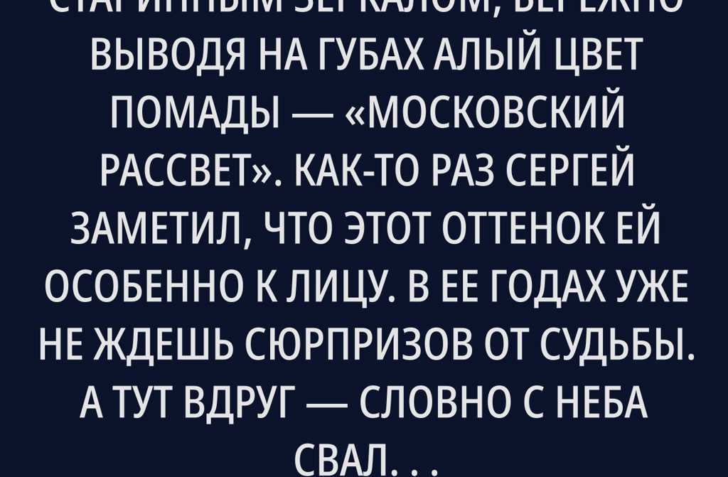 Екатерина сидела перед старинным зеркалом, бережно выводя на губах алый цвет помады «Московский рассвет». Как-то раз Сергей заметил, что этот оттенок ей особенно к лицу.