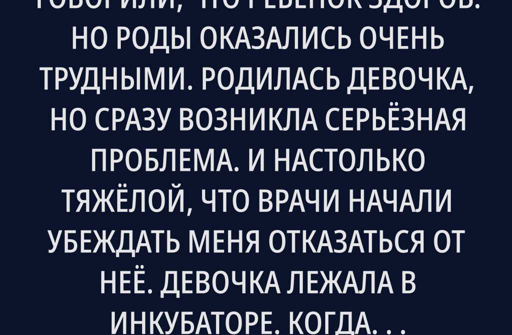 Всё было хорошо. На УЗИ говорили, что ребёнок здоров. Но роды оказались очень трудными. Родилась девочка, но сразу возникла серьёзная проблема. И настолько тяжёлой, что врачи начали убеждать меня отказаться от неё.
