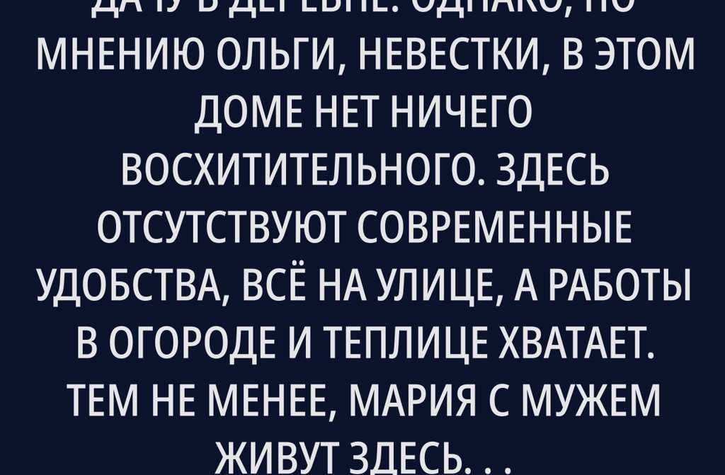 Мария и её муж обожают свою дачу в деревне. Однако, по мнению Ольги, невестки, в этом доме нет ничего восхитительного. Здесь отсутствуют современные удобства, всё на улице, а работы в огороде и теплице хватает. Тем не менее, Мария с мужем живут здесь с апреля по октябрь. Если бы решение было за ними, пожилые супруги остались бы в деревне даже зимой, но для этого им пришлось бы вложить немалые средства в дом. «Было бы куда разумнее отправиться в отпуск на какой-нибудь курорт», считает Ольга.