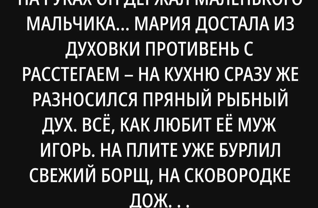 Мария достала из духовки противень с расстегаем на кухню сразу же разносился пряный рыбный дух. Всё, как любит её муж Игорь. На плите уже бурлил свежий борщ, на сковородке дожидался пожаренный сёмгой картофель, оставалось только доварить компот из сухофруктов. Но этим Мария планировала заняться, когда муж войдёт в дом.