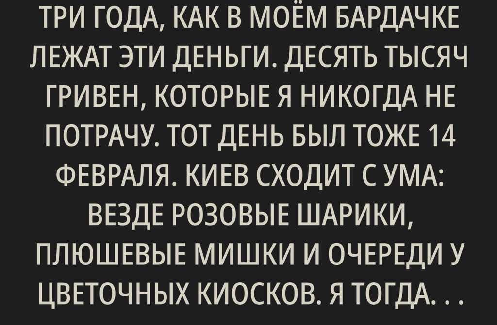 Тот день был тоже 14 февраля. Киев сходит с ума: везде розовые шарики, плюшевые мишки и очереди у цветочных киосков. Я тогда работал таксистом и наблюдал за этим потоком счастья через лобовое стекло: влюблённые парочки, смех, поцелуи. Всё походило на шумный, светлый марафон.