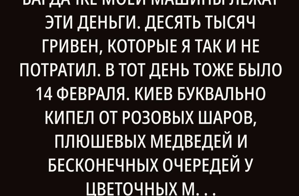 В тот день тоже было 14 февраля. Киев буквально кипел от розовых шаров, плюшевых медведей и бесконечных очередей у цветочных магазинов. В то время я работал таксистом и наблюдал за этим через стекло: счастливые пары, смех, поцелуи. Всё вокруг походило на какой-то яркий и шумный марафон.