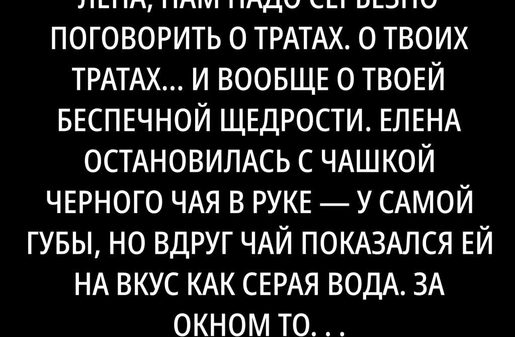 Но у нас общий кошелек, Лена, общий разве не ясно? его голос вдруг зазвенел, как ложка о граненый стакан на даче. Елена невольно стиснула зубы, досчитала до семи. Снег за окном будто усилился.