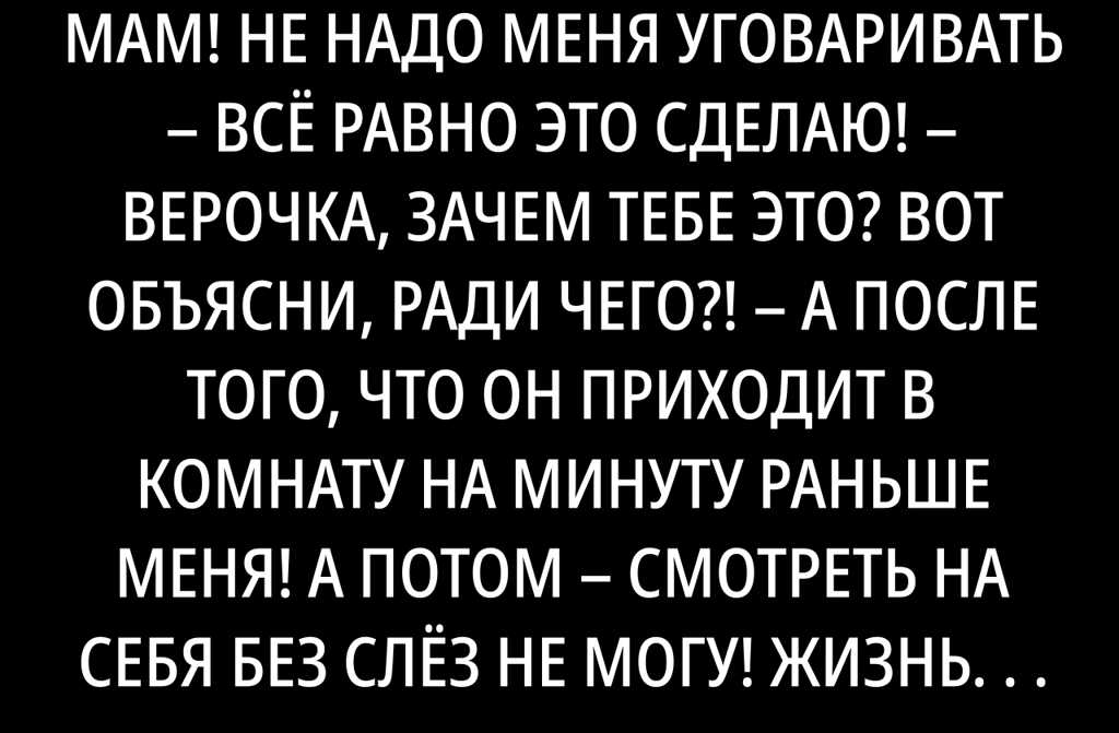 А после того, что он приходит в комнату на минуту раньше меня! А потом смотреть на себя без слёз не могу! Жизнь моя на смарку! Ни семьи, ни детей не будет! Господи, мама! Ты не понимаешь?! Вера разразилась слезами, а расчёска полетела в Тимошку, который решал культурный вопрос с подушкой.