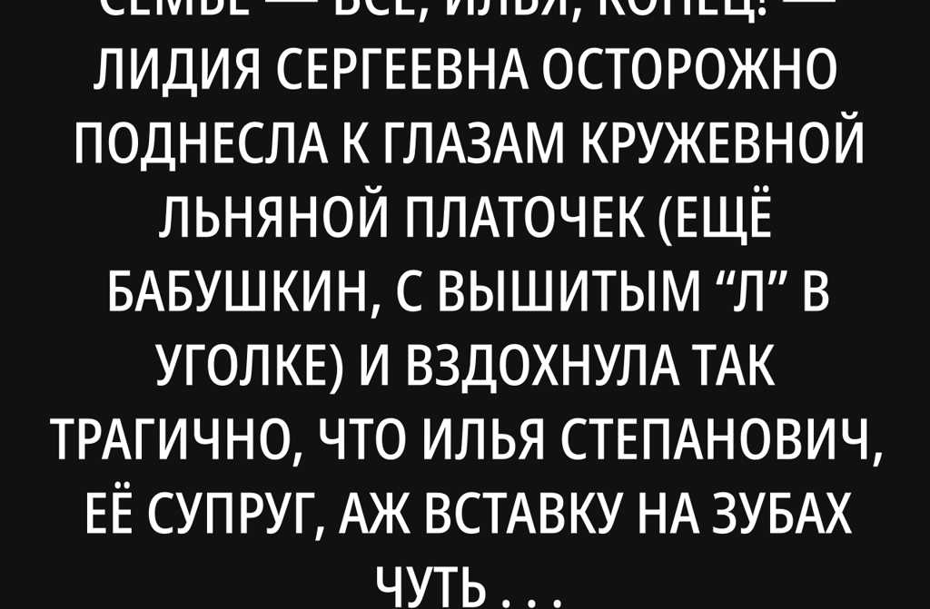 Всё, Илья, конец! Лидия Сергеевна осторожно поднесла к глазам кружевной льняной платочек (ещё бабушкин, с вышитым Л в уголке) и вздохнула так трагично, что Илья Степанович, её супруг, аж вставку на зубах чуть не выплюнул от волнения.