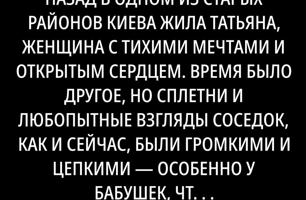 Много лет назад в одном из старых районов Киева жила Татьяна, женщина с тихими мечтами и открытым сердцем. Время было другое, но сплетни и любопытные взгляды соседок, как и сейчас, были громкими и цепкими особенно у бабушек, что вечно сидели на скамейках, словно подсолнухи, провожая взглядами каждую прохожую.