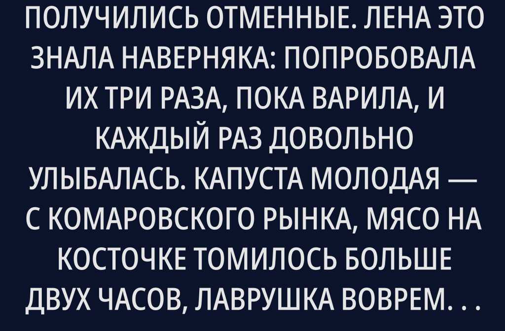Щи получились отменные. Лена это знала наверняка: попробовала их три раза, пока варила, и каждый раз довольно улыбалась. Капуста молодая с Комаровского рынка, мясо на косточке томилось больше двух часов, лаврушка вовремя, чеснок под занавес, как и велит рецепт из книжки. На столе лежала белоснежная скатерть та самая лен, что берегла от всего на свете и даже от кота Гриши. Свечи горели, как положено в больших фильмах про любовь. Пятнадцать лет, всё-таки дата.