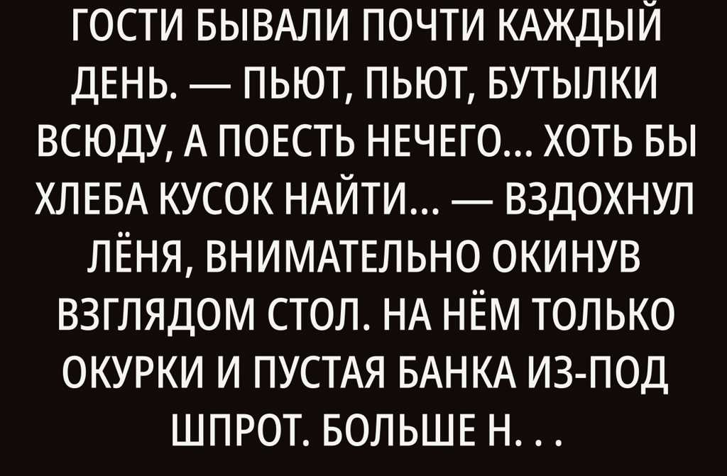 Пьют, пьют, бутылки всюду, а поесть нечего… Хоть бы хлеба кусок найти… вздохнул Лёня, внимательно окинув взглядом стол. На нём только окурки и пустая банка из-под шпрот. Больше ничего.