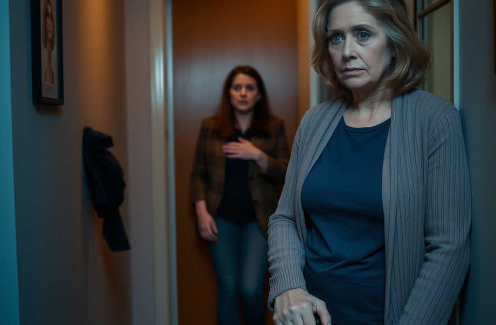 Вы уходите? спрашивает она тещу, стоящую в коридоре, руки скрещённые на груди.