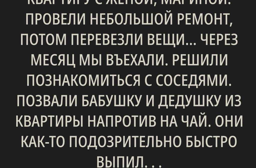 Мы оформили ипотеку на квартиру с женой, Мариной. Провели небольшой ремонт, потом перевезли вещи… Через месяц мы въехали. Решили познакомиться с соседями. Позвали бабушку и дедушку из квартиры напротив на чай.