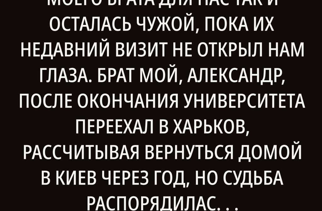 Но и это было не всё: на следующий день, когда мы пошли гулять по Киеву, она вела себя как капризный ребёнок то не так, то не эдак, всё было ей не по душе. Я просто ждал, когда наконец смогу проводить их обратно в аэропорт и выдохнуть с облегчением. Всё гадал, как же Александр смог столько лет быть рядом с таким человеком, ведь её настоящая сущность раскрылась буквально за пару дней.