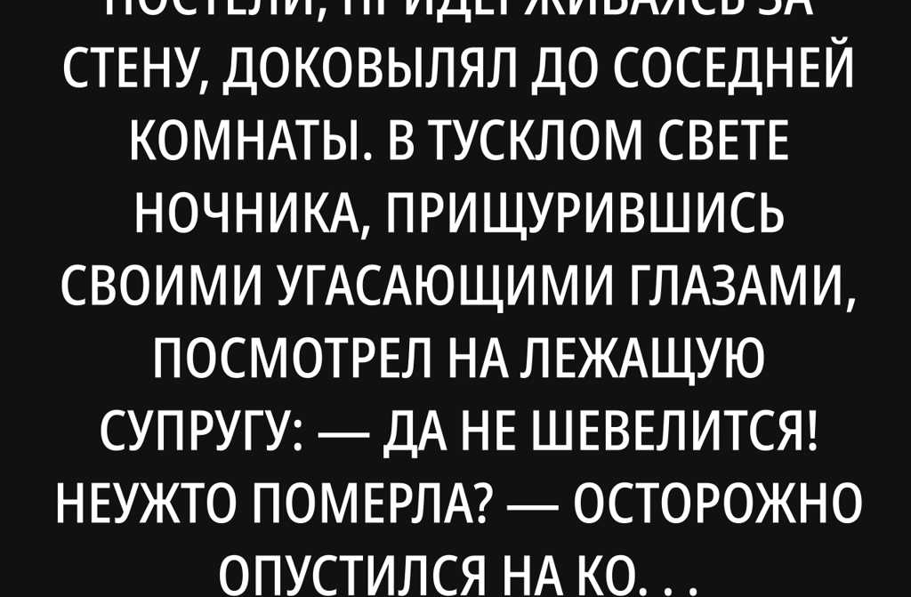 Старичок с трудом поднялся с постели, придерживаясь за стену, доковылял до соседней комнаты. В тусклом свете ночника, прищурившись своими угасающими глазами, посмотрел на лежащую супругу: