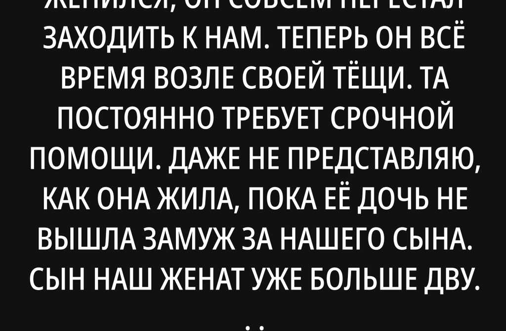 После того как наш сын женился, он совсем перестал заходить к нам. Теперь он всё время возле своей тёщи. Та постоянно требует срочной помощи. Даже не представляю, как она жила, пока её дочь не вышла замуж за нашего сына.