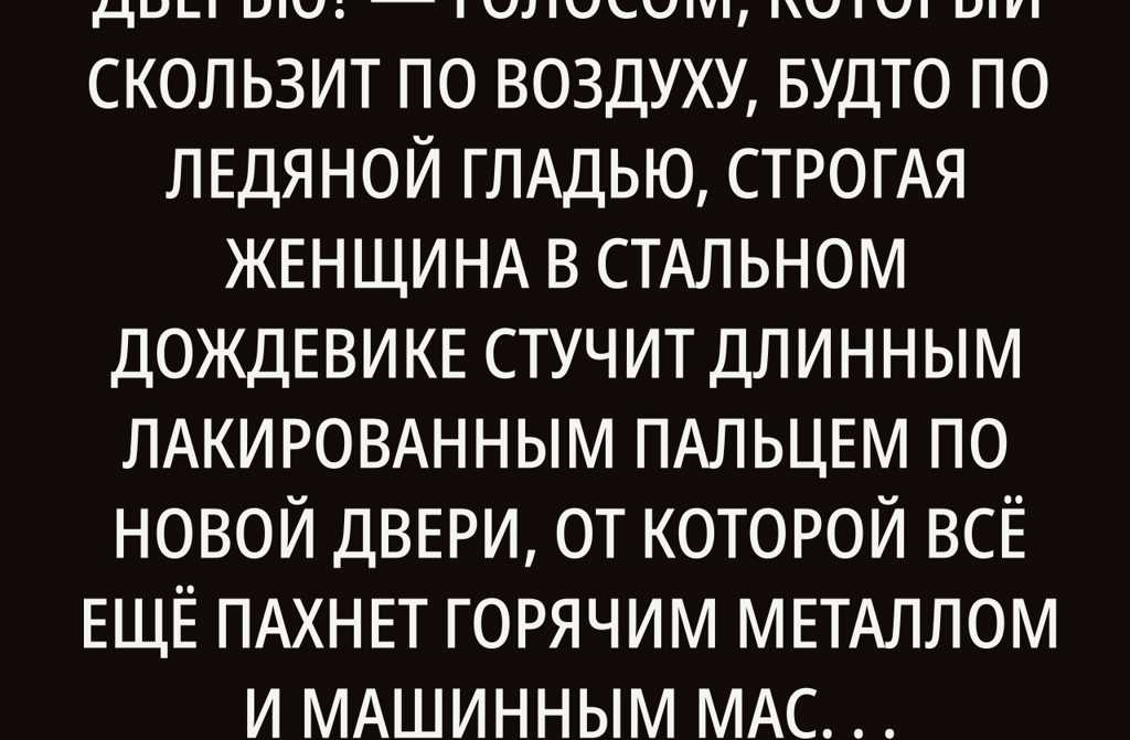 А что у вас, девочки, с этой дверью? голосом, который скользит по воздуху, будто по ледяной гладью, строгая женщина в стальном дождевике стучит длинным лакированным пальцем по новой двери, от которой всё ещё пахнет горячим металлом и машинным маслом. Туман за окном, светло-лиловое небо застывает за мутным стеклом лестничной клетки. Воздух дрожит от ожидания.