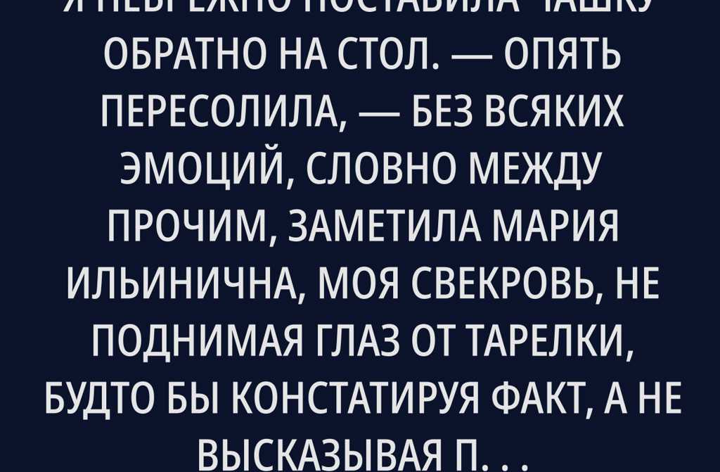 Опять пересолила, без всяких эмоций, словно между прочим, заметила Мария Ильинична, моя свекровь, не поднимая глаз от тарелки, будто бы констатируя факт, а не высказывая претензию.