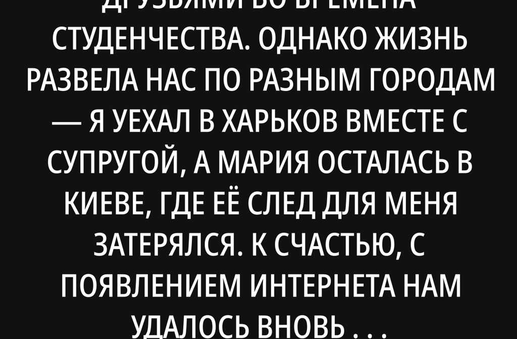Мария и я были близкими друзьями во времена студенчества. Однако жизнь развела нас по разным городам я уехал в Харьков вместе с супругой, а Мария осталась в Киеве, где её след для меня затерялся. К счастью, с появлением интернета нам удалось вновь наладить контакт, и мы возобновили переписку. В одном из наших разговоров Мария поделилась со мной историей о своём зяте.