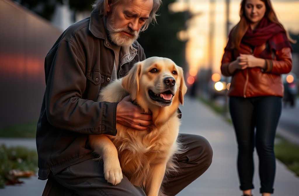 Но вдруг из толпы вырвалась фигура — мужчина в потрёпанной телогрейке, с всклокоченными волосами. Он бросился под колёса, схватил Громку за ошейник и рванул её назад. Раздался визг тормозов. Водитель выручился, остановившись в сантиметре от них.