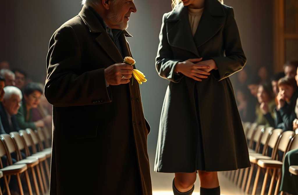 Он прошёл в отель, где шла благотворительная вечеринка. Аглая стояла у сцены элегантная, уверенная, рядом с известными людьми. Он подошёл робко.