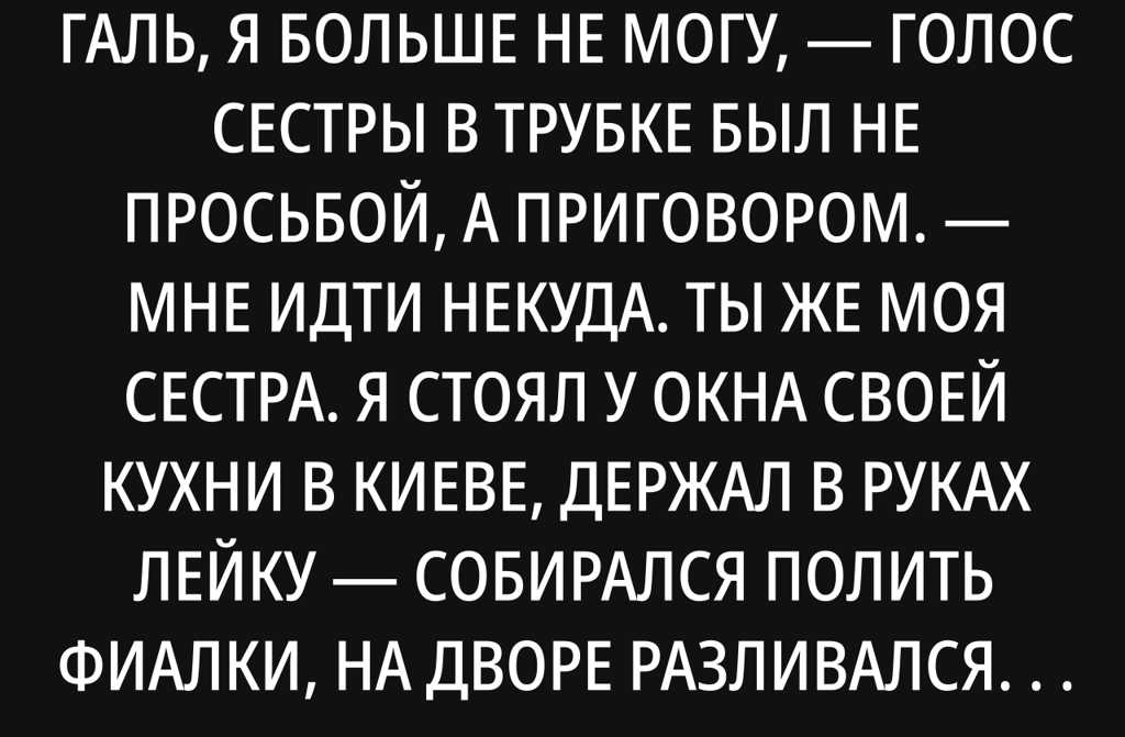 Попрощались. Я долго сидел у окна, смотрел на киевский двор. Как сложится дальше, знал один Господь. Я только понял важное: права на самоуважение и на свою жизнь не убегают вместе с чувством вины. Мы с Ириной родные, но спасать навсегда нельзя. Каждый крутит свою гречку, поливает свою фиалку и сам пишет свою историю.
