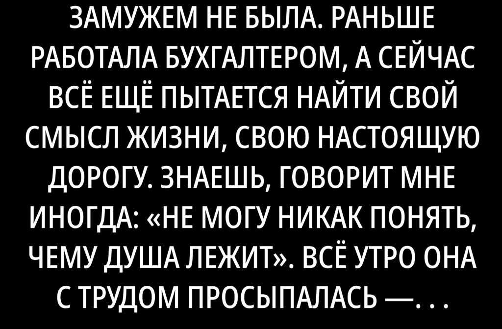 Жанна, ей 37 лет, никогда замужем не была. Раньше работала бухгалтером, а сейчас всё ещё пытается найти свой смысл жизни, свою настоящую дорогу. Знаешь, говорит мне иногда: «Не могу никак понять, чему душа лежит».