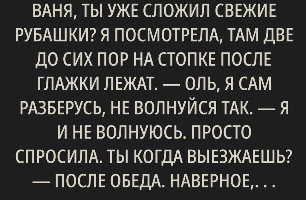 Что делать, когда он вернётся? Как всегда: небольшой подарок, уставший вид, рассказ про переговоры, сядет на диван, спросит: Ну как ты тут, Оль?