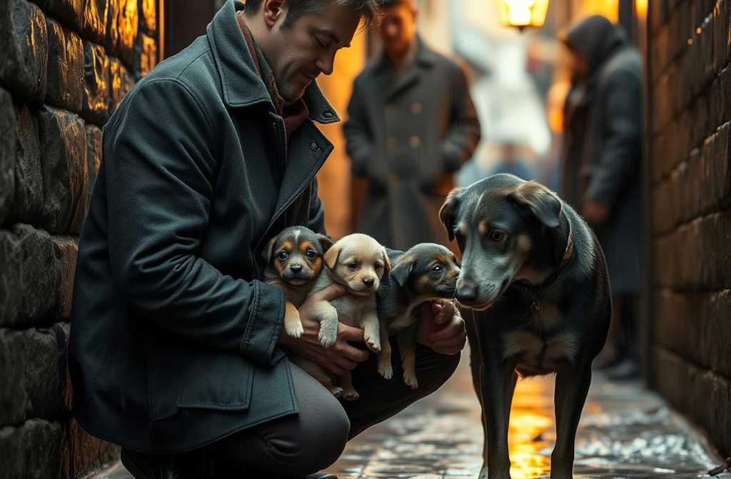 Он пошёл домой, неся под курткой двух спасённых малышей. Она шла позади, держась на расстоянии, но уже не прячась. Хвост её опускался, но в походке появилось странное уверенное спокойствие. В своей скромной квартире Леонид устроил гнездо из старых полотенец в самой тёплой комнате, аккуратно уложил туда щенков, накормил их теплым молоком из пипетки. Мать лёгла рядом, вытянув голову на лапы, её взгляд стал мягким. Она успокоилась, а её хвост, едва слышно, постучал по полу, прося остаться.