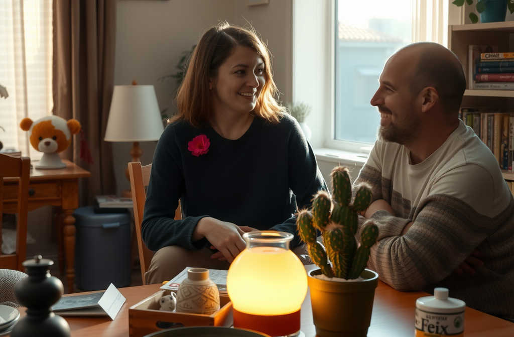 В гостиной чашки, пятно на скатерти, сердечко, кактус Фёдор на подоконнике.
