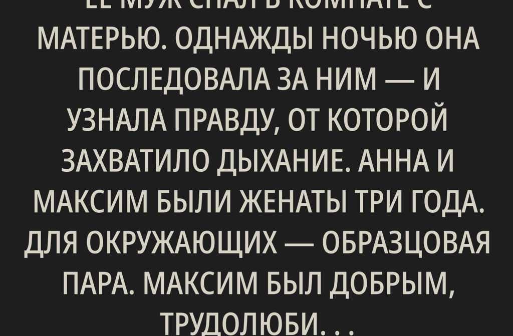 Каждую ночь, примерно в полночь или час ночи, Максим осторожно поднимался с кровати. Осторожно высвобождал руку из-под обнимающей Анны и выходил из комнаты. Он шёл в комнату своей матери, Евгении Петровны, которая жила с ними. Возвращался он только на рассвете.