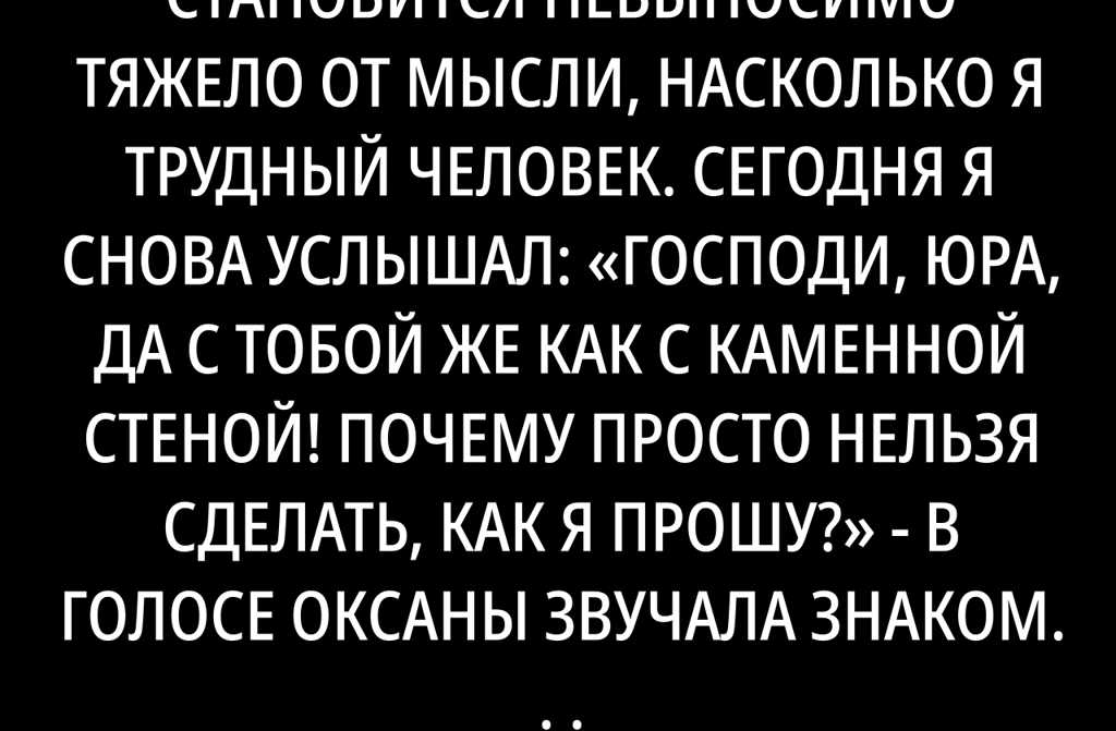 Иногда мне становится невыносимо тяжело от мысли, насколько я трудный человек. Сегодня я снова услышал: «Господи, Юра, да с тобой же как с каменной стеной! Почему просто нельзя сделать, как я прошу?» – в голосе Оксаны звучала знакомая обида, даже отчаяние.