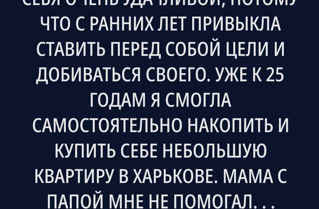 Ты знаешь, я всегда считала себя очень удачливой, потому что с ранних лет привыкла ставить перед собой цели и добиваться своего. Уже к 25 годам я смогла самостоятельно накопить и купить себе небольшую квартиру в Харькове.