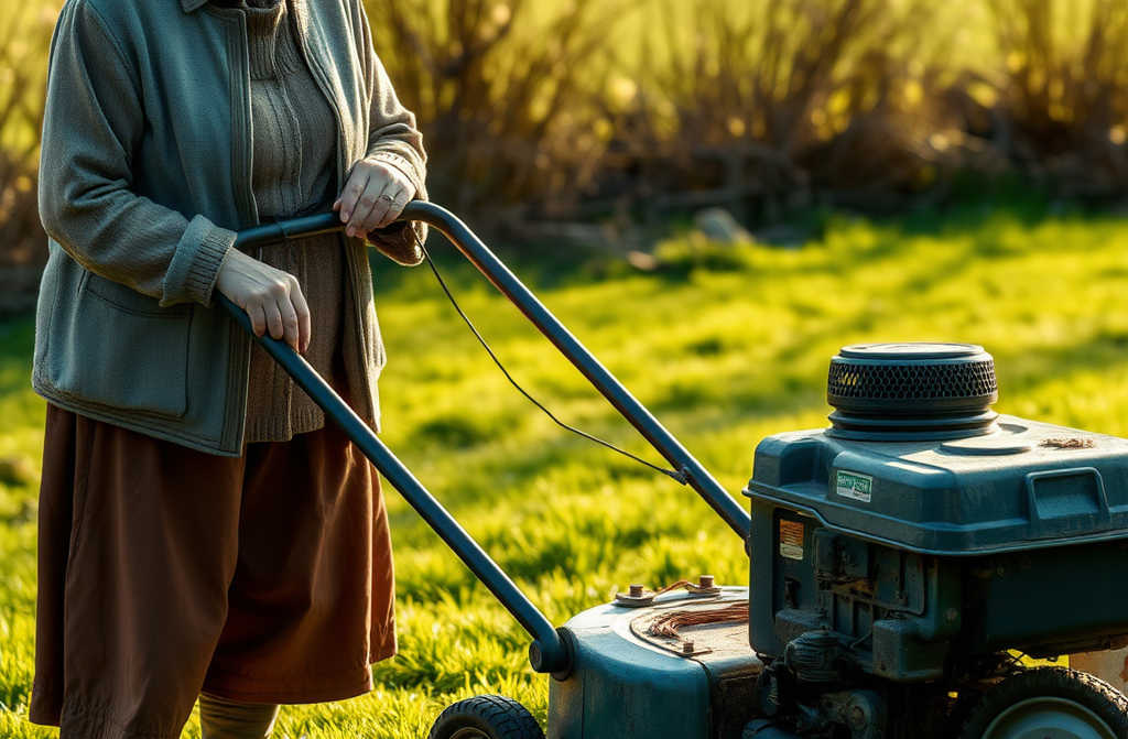 А у меня? У меня старая газонокосилка с облезлой краской, характером упрямой козы и капризным стартером.