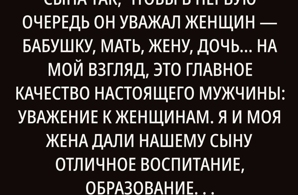 Я всегда старался воспитывать сына так, чтобы в первую очередь он уважал женщин бабушку, мать, жену, дочь… На мой взгляд, это главное качество настоящего мужчины: уважение к женщинам. Я и моя жена дали нашему сыну отличное воспитание, образование и всё, что было нужно, чтобы он смог самостоятельно построить своё светлое будущее. Больше мы не хотели ему помогать ни с чем, но всё же купили ему двухкомнатную квартиру. Сын работал, обеспечивал себя, но на собственное жильё ему всё равно не хватало денег.