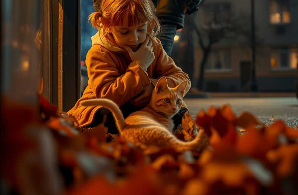 Рыжий кот замерзал. Он совсем не знал, куда идти и где спрятаться. Поэтому нашёл большую кучу сухих оранжевых листьев, забрался в неё и свернулся калачиком. Сначала было очень холодно он дрожал, но потом, когда его рыжая шерстка отсырела и задубела на морозе, откуда-то внутри стало теплее. Какой-то тихий голос шептал добрые слова, убаюкивал и звал закрыть глаза и забыть обо всём плохом.