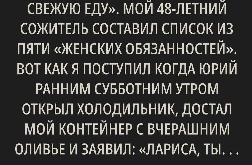 «Я не ем вчерашнее, готовь мне свежую еду». Мой 48-летний сожитель составил список из пяти «женских обязанностей». Вот как я поступил