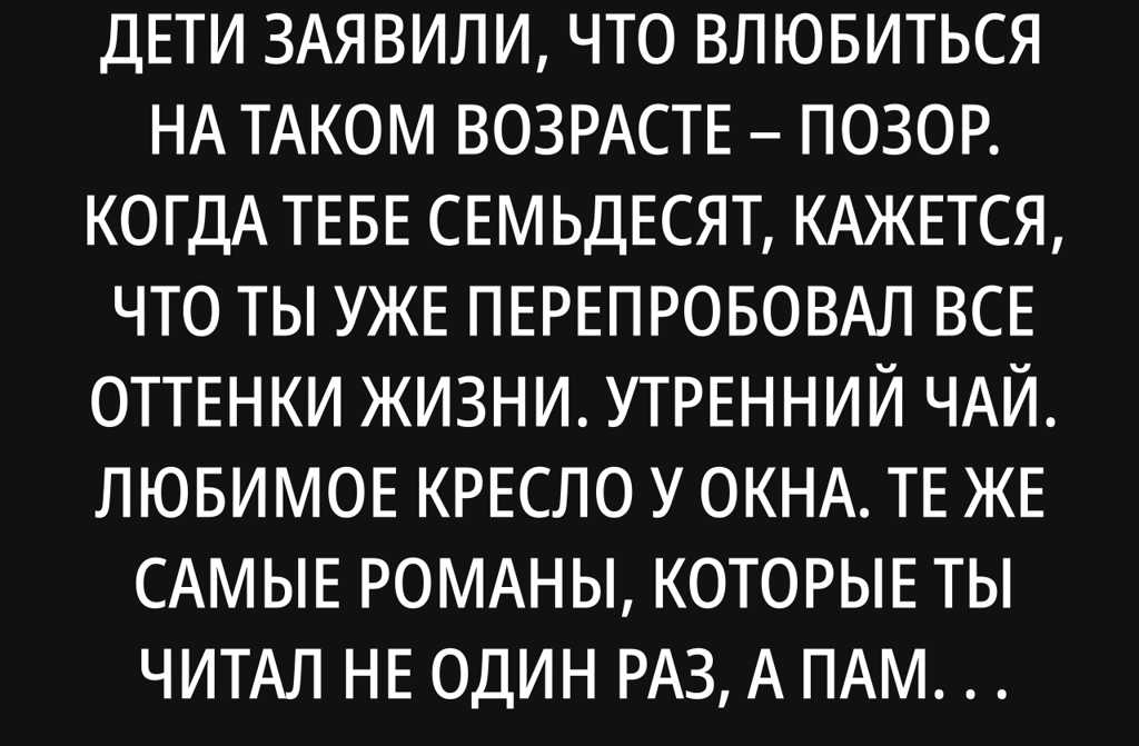 Когда тебе семьдесят, кажется, что ты уже перепробовал все оттенки жизни. Утренний чай. Любимое кресло у окна. Те же самые романы, которые ты читал не один раз, а память уже не такая чёткая, как прежде. Тишина, что остаётся после сорокалетнего брака, когда уходят любимые.