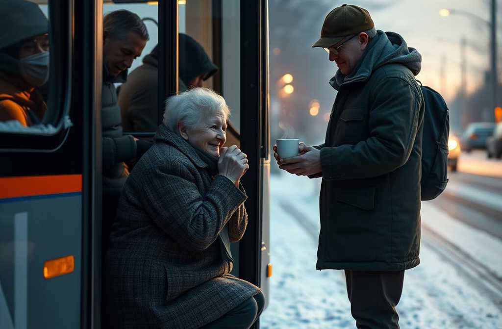 Мария Ивановна медленно подошла к двери. Каждый её шаг давался усилием. Двери с грохотом открылись, и ледяной ветер ударил её в лицо. Она остановилась на ступеньке, не отводя глаз от водителя, и тихо, но твёрдо произнесла: «Тебя я когдато родила, сынок, с любовью. А теперь ты не позволяешь даже мне сесть». Затем она вышла и ушла в снежную стужу.