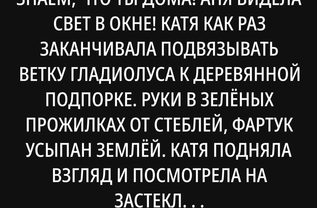 Суббота наступает через четыре дня обычные рабочие будни с поставками и расценками, с Надиными вопросами. Катя не думает нарочно о субботе просто живёт. Иногда вспоминает спокойный голос, анемоны в руках. До субботы, Андрей.