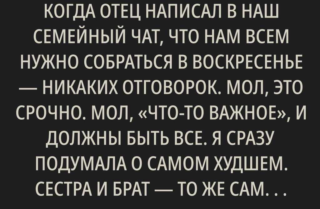 Все началось в среду вечером, когда отец написал в наш семейный чат, что нам всем нужно собраться в воскресенье никаких отговорок. Мол, это срочно. Мол, «что-то важное», и должны быть все.