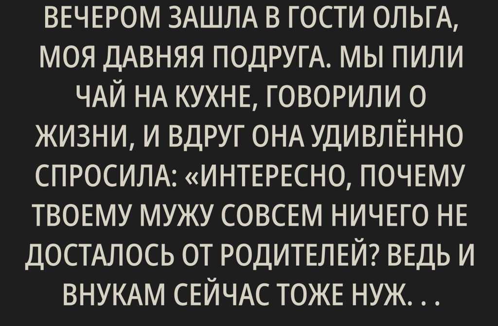 Сегодня вечером зашла в гости Ольга, моя давняя подруга. Мы пили чай на кухне, говорили о жизни, и вдруг она удивлённо спросила: «Интересно, почему твоему мужу совсем ничего не досталось от родителей? Ведь и внукам сейчас тоже нужна поддержка».