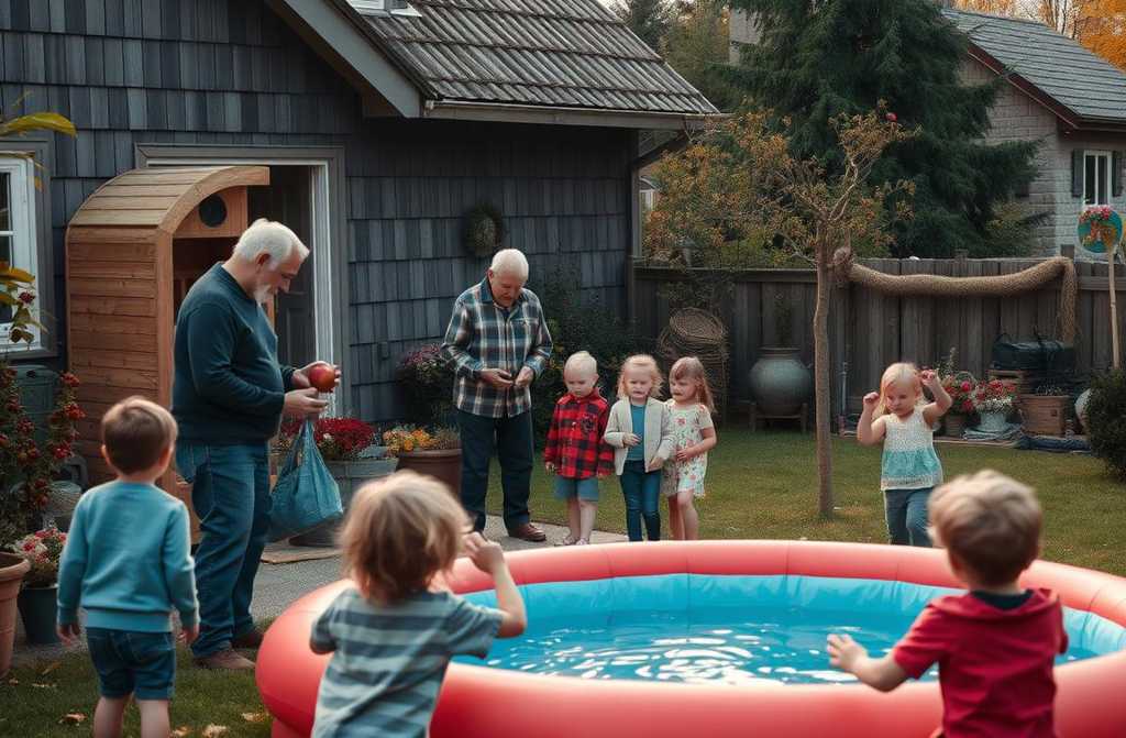 Что ей ни говори она всё переиначивала и не уходила. Её внуки лезли везде: трясли яблони, забирались на крышу бани хорошо, не свалились. Потом их привлекли камни вокруг строений. Кто-то начал кидать их в надувной бассейн. Заметили не сразу. Дети с визгом разбежались, когда оттуда хлынула вода.