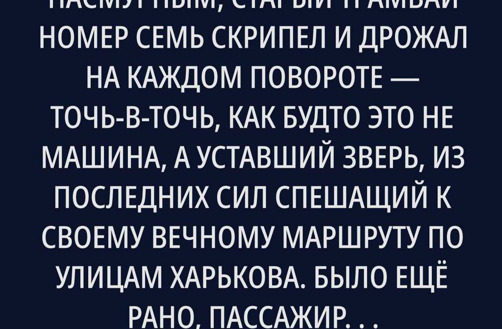 Утро выдалось пасмурным; старый трамвай номер семь скрипел и дрожал на каждом повороте точь-в-точь, как будто это не машина, а уставший зверь, из последних сил спешащий к своему вечному маршруту по улицам Харькова. Было ещё рано, пассажиры стояли плотно, каждый уткнувшись в свой смартфон, лица как холодная стена, и все суетливо спешили по делам.