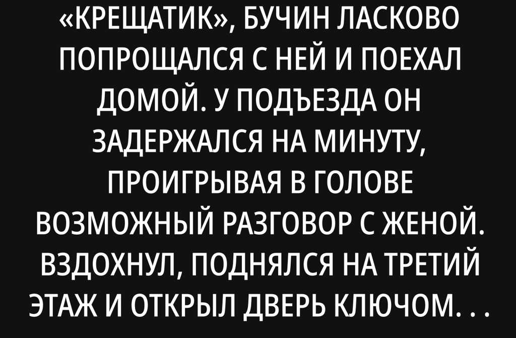 Высадив свою пассию из машины возле станции метро «Крещатик», Бучин ласково попрощался с ней и поехал домой. У подъезда он задержался на минуту, проигрывая в голове возможный разговор с женой. Вздохнул, поднялся на третий этаж и открыл дверь ключом.