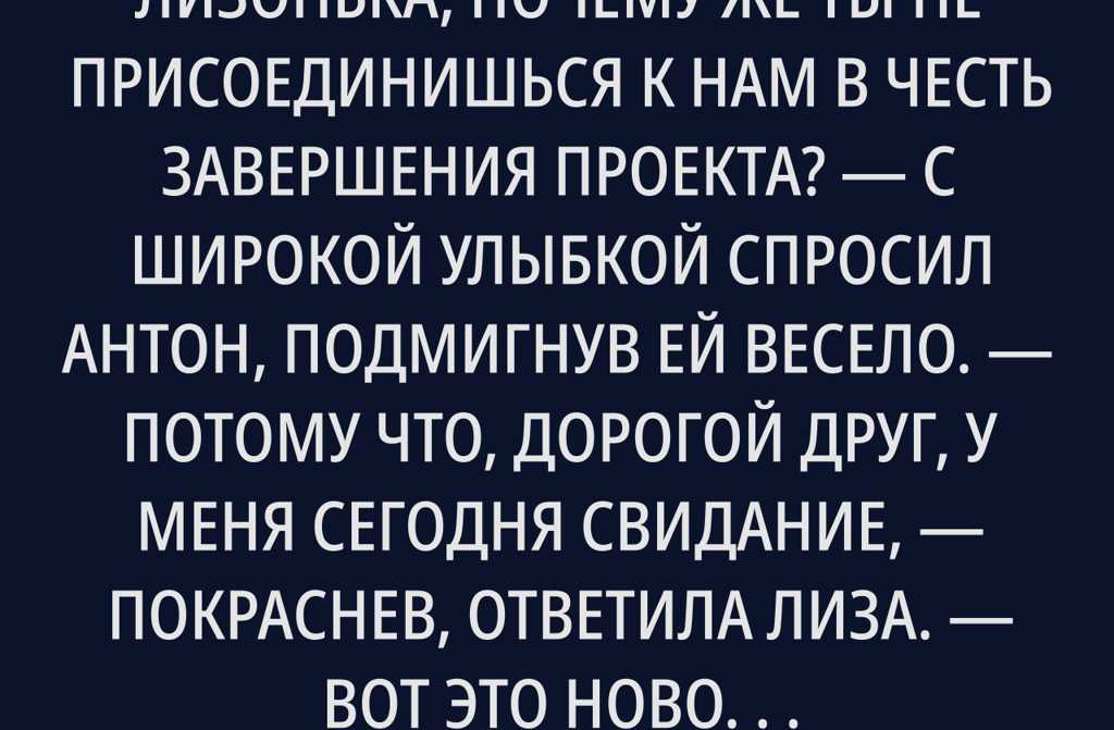 Лизонька, почему же ты не присоединишься к нам в честь завершения проекта? с широкой улыбкой спросил Антон, подмигнув ей весело.