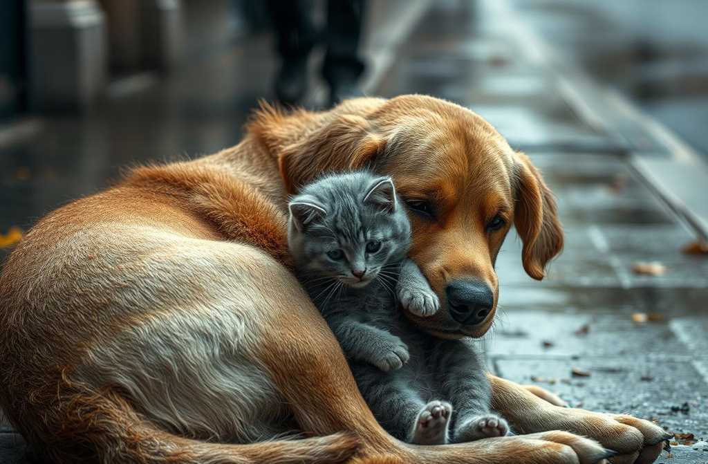 Иногда пёс, обняв лапами своего детёныша, прижимал его к себе, укрывая от холода и воды. Он дрожал, но вылизывал малыша. Главное было согреть и накормить его.