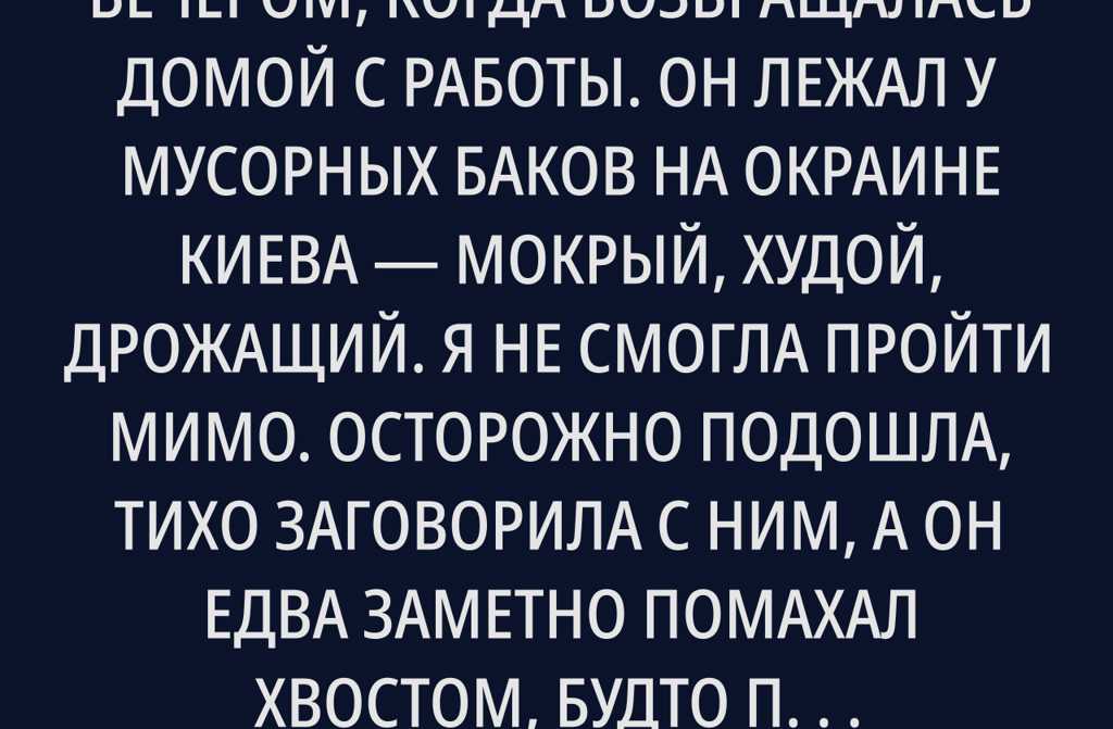 Я подобрала его во вторник вечером, когда возвращалась домой с работы. Он лежал у мусорных баков на окраине Киева мокрый, худой, дрожащий. Я не смогла пройти мимо. Осторожно подошла, тихо заговорила с ним, а он едва заметно помахал хвостом, будто просил о помощи. Я подняла его, принесла в свою однокомнатную квартиру и вытерла старым полотенцем. Даже не ожидала, что из-за этого разразится настоящая буря.