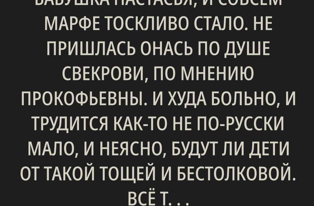 Умерла бабушка Настасья, и совсем Марфе тоскливо стало. Не пришлась онась по душе свекрови, по мнению Прокофьевны. И худа больно, и трудится как-то не по-русски мало, и неясно, будут ли дети от такой тощей и бестолковой.