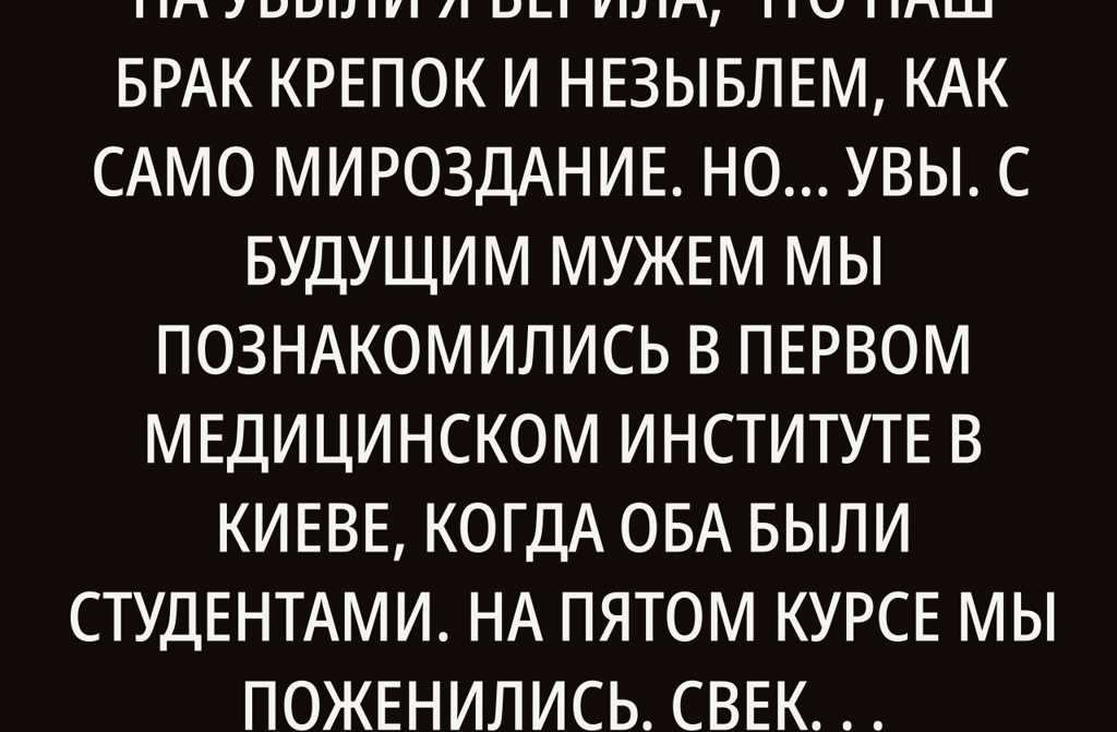 С будущим мужем мы познакомились в Первом медицинском институте в Киеве, когда оба были студентами. На пятом курсе мы поженились. Свекровь, как подарок к свадьбе, вручила нам путёвки в Крым и ключи от квартиры. А это было только началом.